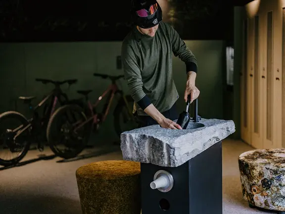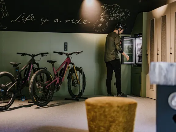 In unserem großzügigen und bestens ausgestatteten Bike- und Skiraum kannst du nicht nur Bikes und Skier sicher verstauen, du findest auch viele Goodies und praktische Tools wie Werkbank, Waschmaschine, Trockner, Sprossenwand, Yogamatten, Kühlschrank mit kühlen Drinks und mehr. Herzstück und Eyecatcher ist der Trinkbrunnen aus heimischem Stein für deine Erfrischung für unterwegs.